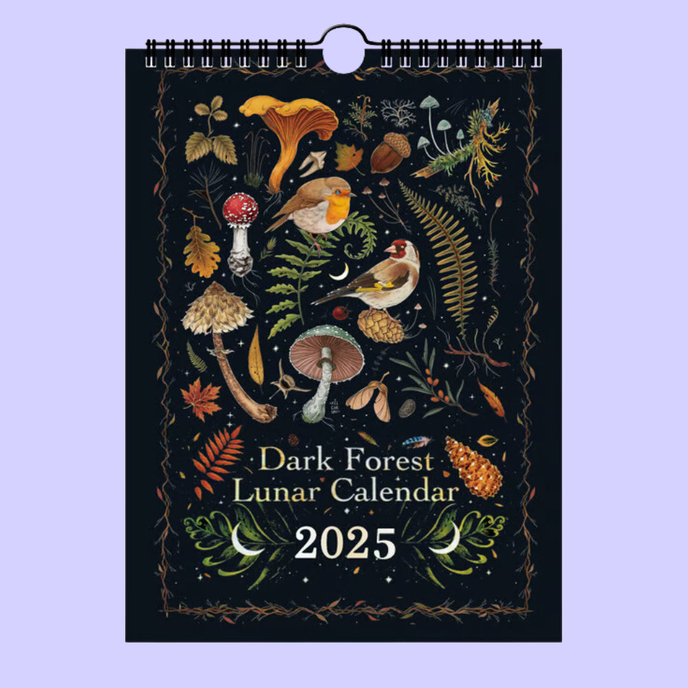✧Dark Forest Lunar Calendar 2025: Features 12 original illustrations that I have drawn throughout the year. Botanical motives, magical creatures and plants, forest, nature, wild life, the moon and stars and the power within us. The grid with all the information and icons was handmade.
